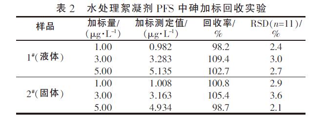 在選定儀器工作條件下,對空白溶液進(jìn)行11次砷吸光度連續(xù)測定,根據(jù)3倍標(biāo)準(zhǔn)偏差與對應(yīng)的砷工作曲線斜率,儀器自動(dòng)求出該方法砷的檢出限為0.02μg/L,若取1gPFS樣品換算成質(zhì)量分?jǐn)?shù)則為0.002mg/kg,完全滿足日常產(chǎn)品檢測要求。選用2μg/L砷標(biāo)準(zhǔn)溶液、1#和2#樣品進(jìn)行11次平行測定,相對標(biāo)準(zhǔn)偏差(RSD)分別為2.6%、1.5%、1.8%,表明方法(1)具有較高的精密度。