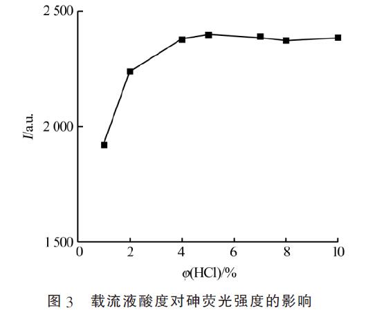 根據(jù)相關(guān)資料,硝酸對熒光強(qiáng)度有負(fù)干擾作用,有可能被樣品機(jī)體還原成亞硝酸根,降低預(yù)還原劑作用,因此實(shí)驗(yàn)選取HCl作為介質(zhì)。HCl酸度對氫化物反應(yīng)的影響見圖3。由圖3可知,選擇體積分?jǐn)?shù)為5%鹽酸作為載流溶液時(shí)具有較好的分析結(jié)果。