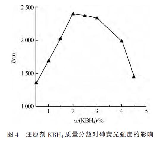 質(zhì)量分?jǐn)?shù)KBH4具有強(qiáng)還原性,常溫下能與水發(fā)生反應(yīng)。作為氣態(tài)氫化物發(fā)生體系的還原劑,對實(shí)驗(yàn)結(jié)果的靈敏度、準(zhǔn)確度均產(chǎn)生非常大的影響,濃度低時(shí)氣態(tài)物難形成,濃度高時(shí)產(chǎn)生過多的氫氣反而會(huì)引起氣相干擾,降低靈敏度。保持其他條件不變,選取不同質(zhì)量分?jǐn)?shù)的KBH4測定標(biāo)準(zhǔn)溶液的熒光強(qiáng)度,結(jié)果見圖4。選取KBH4質(zhì)量分?jǐn)?shù)為2.0%,可以滿足As測定的要求。